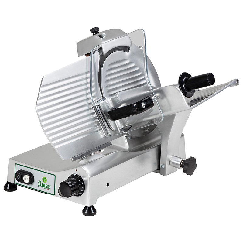 Light anodized aluminum alloy casing – tray block – blade protection fixed ring – cutting thickness from 0 to 15 mm – extractable blade guard – blade adjustment knob with graduated scale – fixed sharpener with a pair of grinders to sharpen the blade.